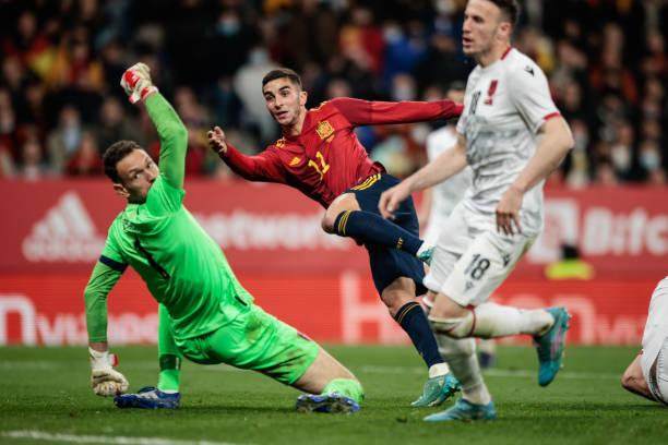 阿尔巴尼亚全场压迫做得非常出色,很轻易在反击中推进到西班牙的禁区前,形成以少打少的机会。一方面,西班牙在中场防守上无法形成屏障,而保·托雷斯和埃里克单防实力稍显薄弱,正面勉强应付对方持球突进人员。第85分钟,阿尔巴尼亚中场抢断向前冲吊,保·托雷斯头球回顶角度失准,球刚好砸在并肩向前的乌祖尼脸上变向弹进大门。一次不算机会的机会导致丢球,西班牙防线显然还需锤炼。